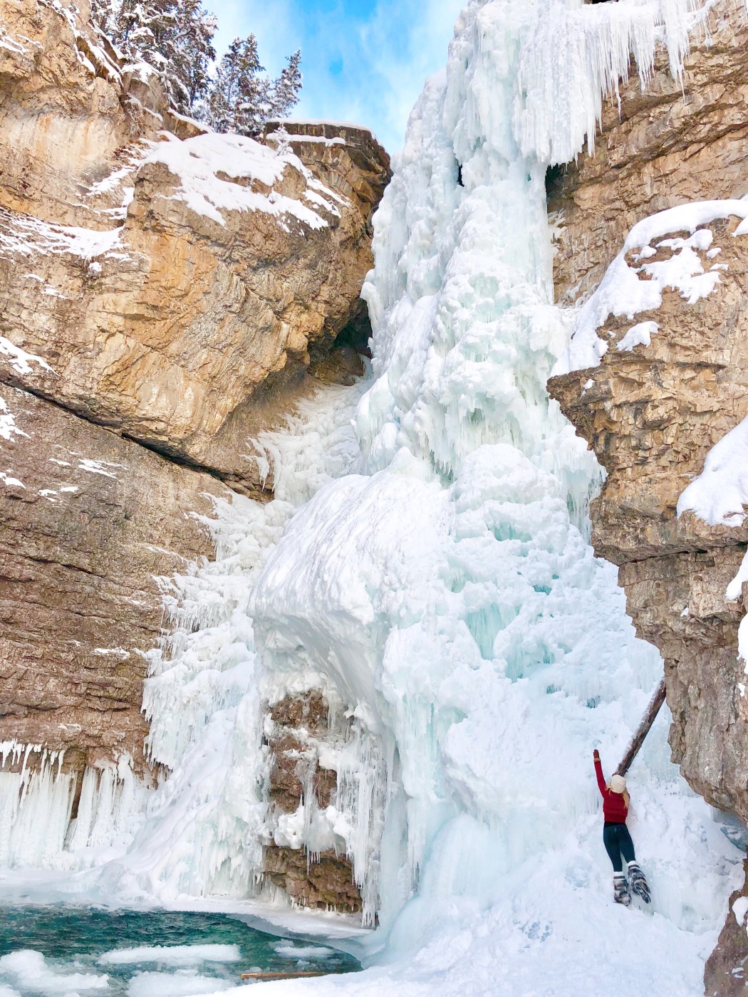 We continued along the 2.7 km hike to the upper falls in the -20 degrees weather. Luckily, I wore 2 layers of everything (even 2 jackets and 2 pairs of mitts). I recommend layering if you are doing this in the cold. My hair even turned into little icicles! When we arrived at the upper falls, we noticed a couple of young boys had jumped off the platform to get a closer look. Me being adventurous, decided to follow. My gymnastics skills came in handy as I hung from the 7 foot tall platform and dropped to the ground. I was able to actually touch the falls and pretend to climb them. Looking back, it would be unfortunate if one of the icicles fell on me. Do this at your own risk!